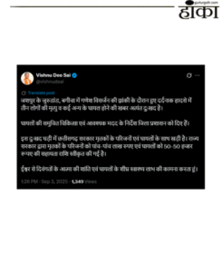 जशपुर, जिला के बगीचा विकासखंड के जुरुडांड म गणेश विसर्जन के झांकी के समय होए दर्दनाक हादसा म तीन मनखे मन के मृत्यु अऊ कई आन मनखे मन के घायल होए के घटना म मुख्यमंत्री श्री विष्णु देव साय ह गहरा दुःख व्यक्त करे हे। मुख्यमंत्री ह कहिन के ए हृदयविदारक घटना ले मैं व्यथित हंव। ईश्वर ले दिवंगत आत्मा मन के शांति अऊ घायल मन के लउहे स्वास्थ्य लाभ के कामना करत हंव। उमन शोक संतप्त परिजन मन के प्रति संवेदना प्रकट करत कहिन के ए दुःख के घड़ी…